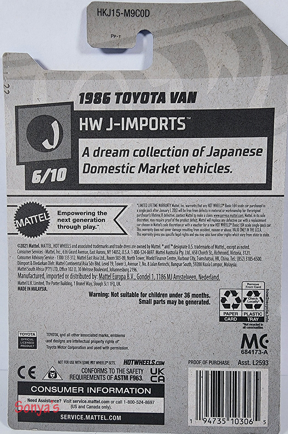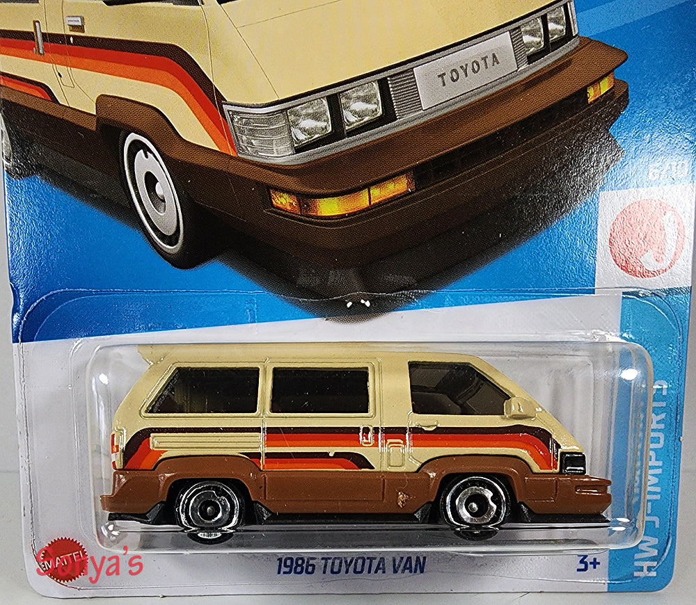 Bring the fun of your childhood back with the Hot Wheels Brown 1986 Toyota Van 2023. This retro toy features a classic 1986 Toyota Van design, sure to be a great addition to any collection of toys. Features some classic retro colors in tan, orange and brown with silver hubs and a black base. From HW J-Imports, car 6 of 10.