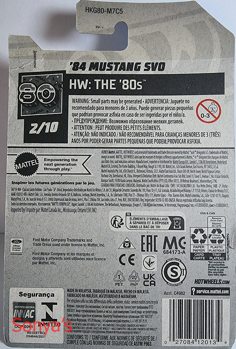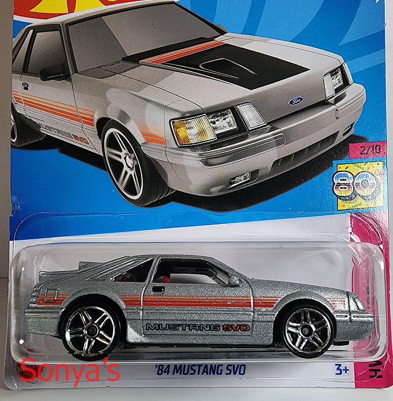 The Hot Wheels Gray 84 Mustang SVO 2023 is the perfect way to add an '80s-inspired vintage Mustang to your collection. Its sleek and timeless design will turn heads, and it's the perfect addition to any Hot Wheels collection. Features red interior and silver double spokes. From HW The 80's, car 2 of 10.