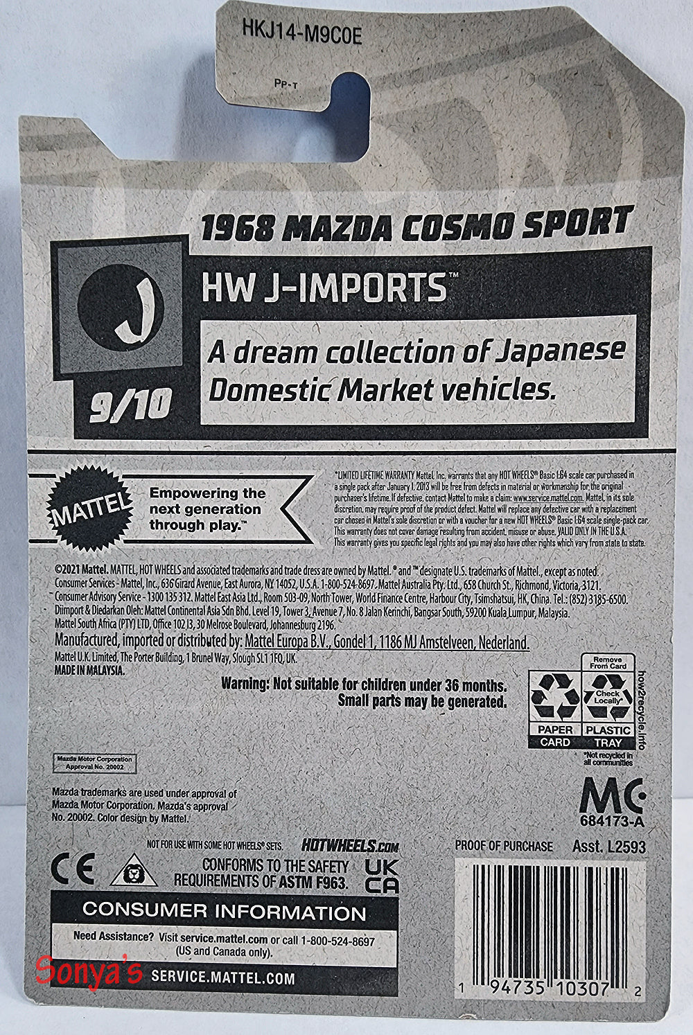 This Hot Wheels Orange 1968 Mazda Cosmo Sport 2023 is a collector's dream! With its fiery orange hue and pristine white accents. From HW J-Imports, car 9 of 10.