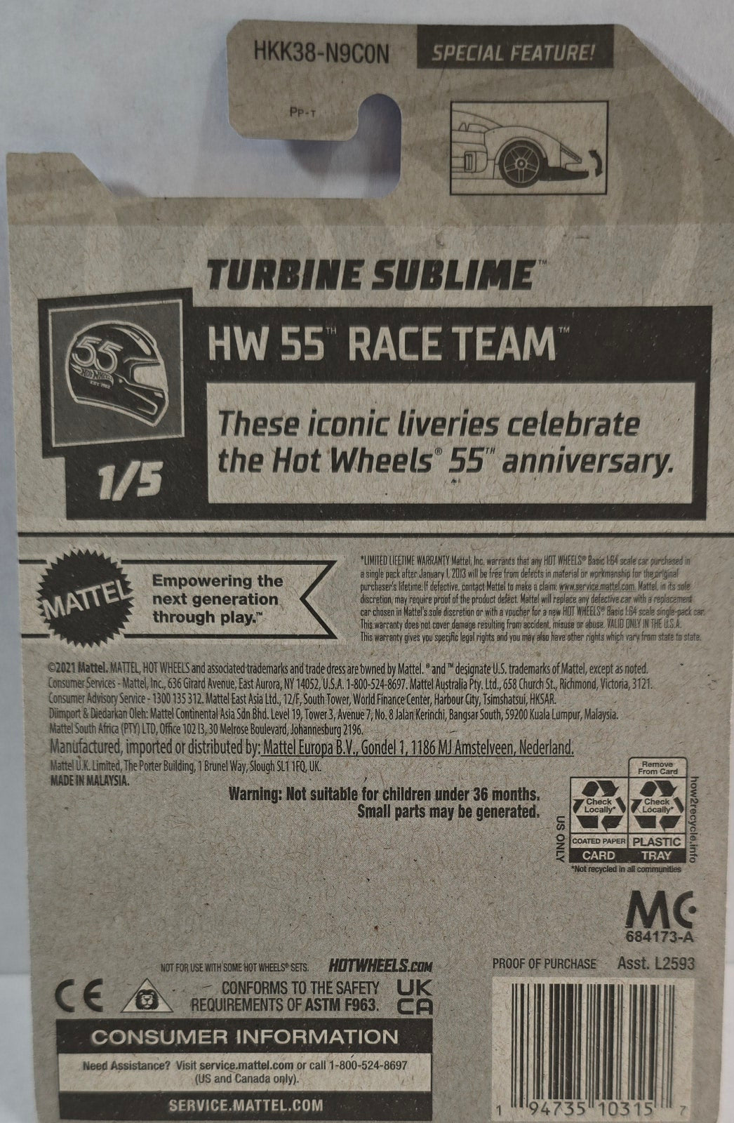 Celebrating Hot Wheels 55th anniversary in style with this racer in Hot Wheels livery primary white. Features gray wheels and orange accents. From HW 55 Race Team, car 1 of 5. Special feature on the flip down bumper.