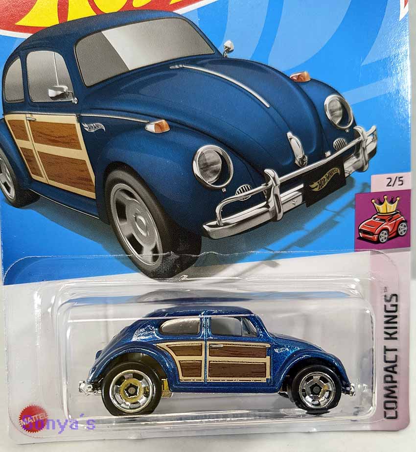 This classic twist on a VW Beetle features the wood paneled sides and blue metallic paint. The oversized tires have multi spoked silver wheels and it's riding on a chrome base. From Compact Kings, this is car 2 of 5.