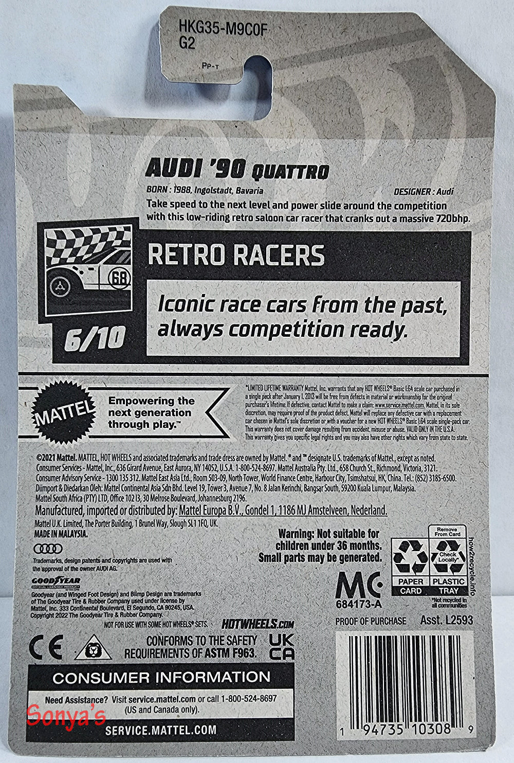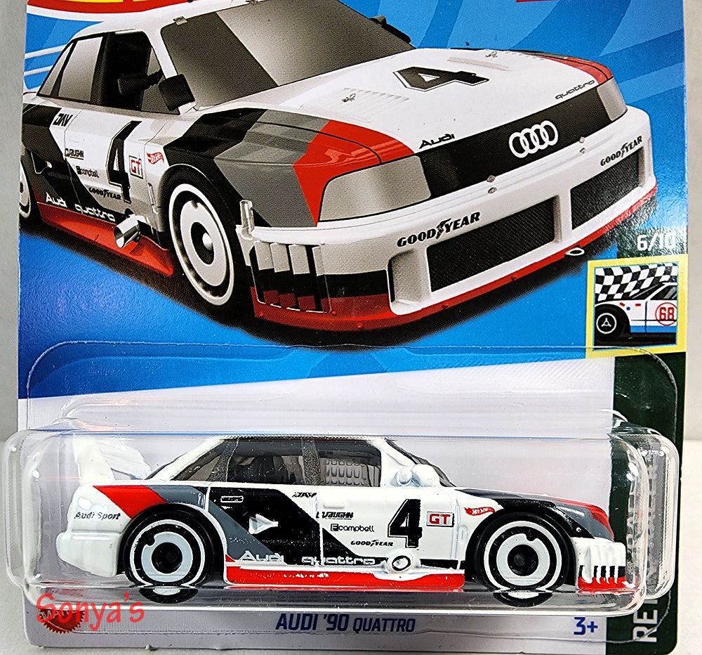 This Hot Wheels White Audi '90 Quattro 2023 is a must-have for any car enthusiast. Featuring sleek graphics and a classic Audi design, this mini model will make a statement on any shelf. With its pearl white color and authentic design, this model will be a great addition to your collection. Number 6 of 10 from the Retro Racers group.