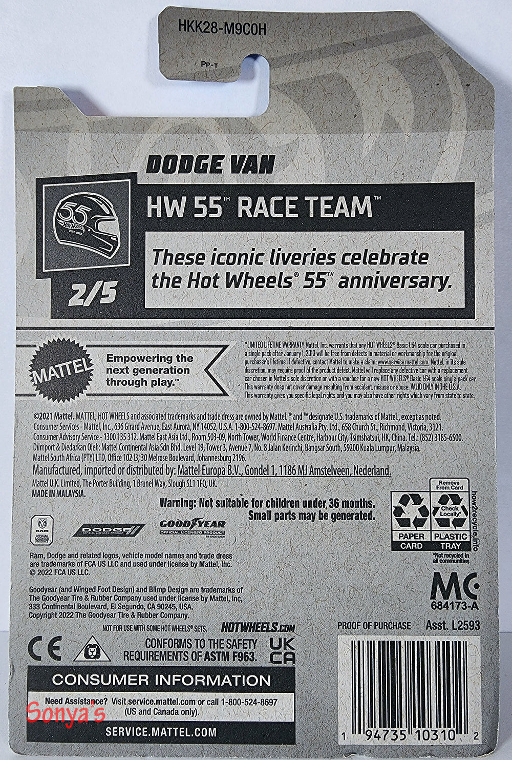 A classic Dodge van in Hot Wheels livery on white joins the HW 55 Race Team. Refreshing look with 55th on the side panel and painted front lights. Features bright orange "glass" over a chrome interior. A must have for your collection.