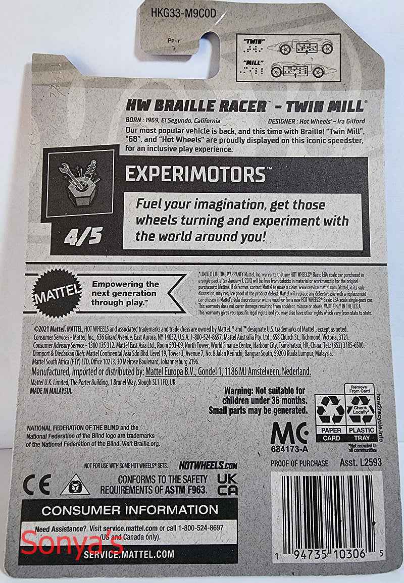 Take your race skills to the next level with the Hot Wheels White HW Braille Racer-Twin Mill 2023. Featuring a unique braille design as well as a Twin Mill experiment, this Hot Wheels car is sure to provide an exhilarating experience. Ideal for speed and control, this car is perfect for the racetrack. Done in pure white pearl with braille on the packaging as well as the car. From Experimentors, car 4 of 5.